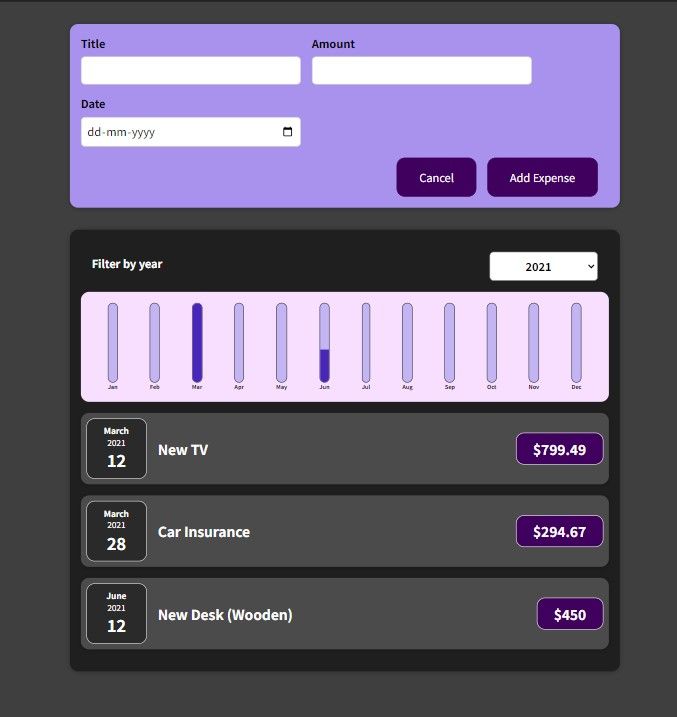 Expense Tracker: Easily add expenses with title, amount, and date, filter by year for a chart and item breakdown.