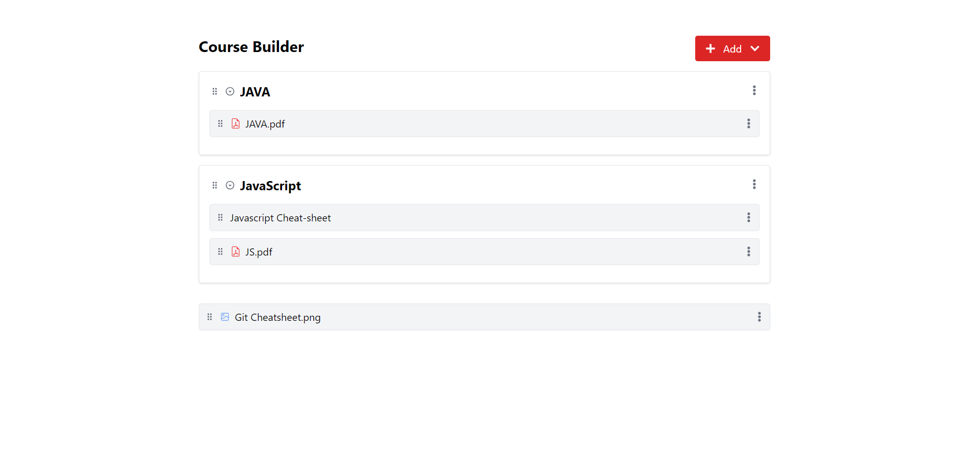 A Course Builder lets users add modules, upload resources, and reorder content easily.