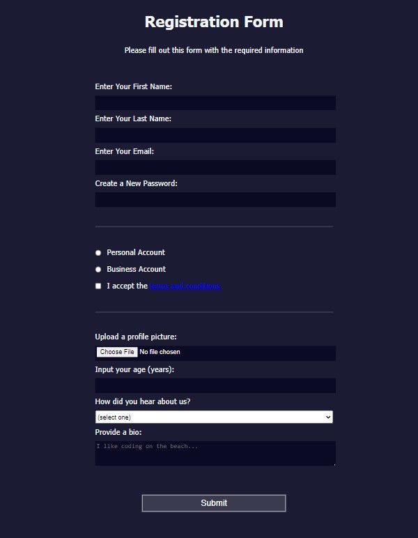 Versatile registration form with name, email, password, profile picture, age, bio, and the option to choose personal or business accounts.